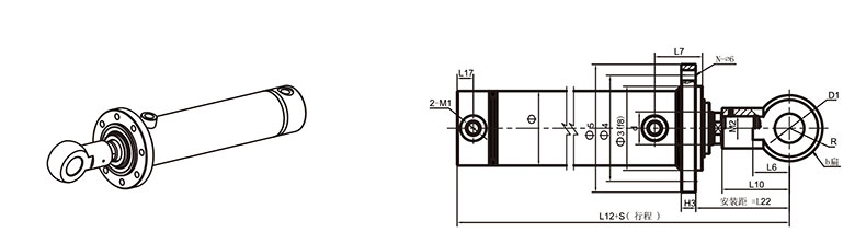 活塞桿端為外螺紋桿頭耳環(huán)連接