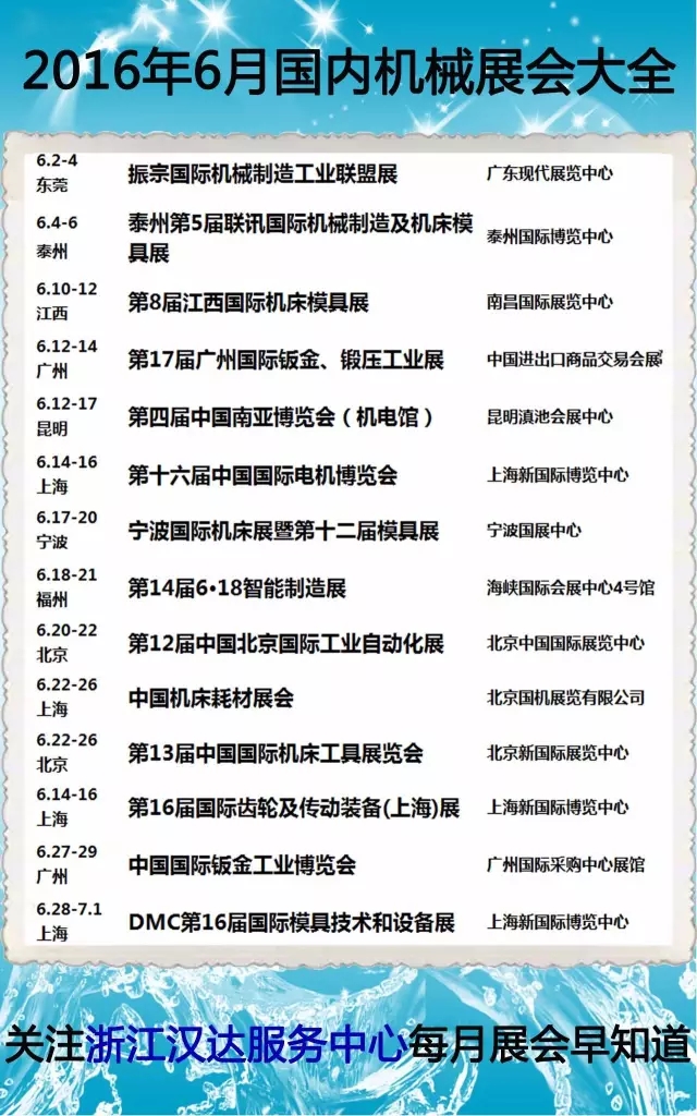 廣大工業(yè)機(jī)械從業(yè)者們,我們整理了2016年6月份展會(huì)一覽,展會(huì)時(shí)間、名稱、地點(diǎn)均有一一核對(duì)檢查,確保無誤,請各位放心參考。